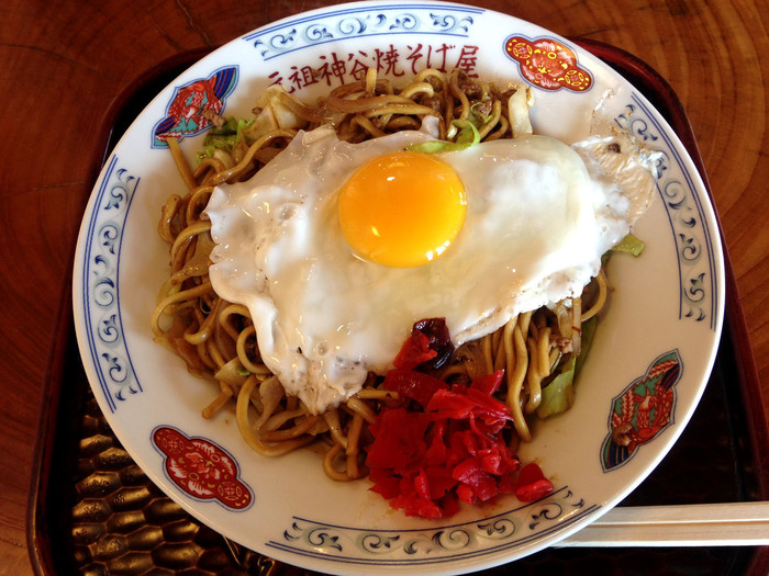 目玉焼きの黄身を崩して、ちょっと多めの出汁入りソースと絡めて食べるのが横手流です。麺は縮れた蒸し麺ではなく、茹でたストレートの角麺を使い、柔らかくしんなりとした出来上がりになります。