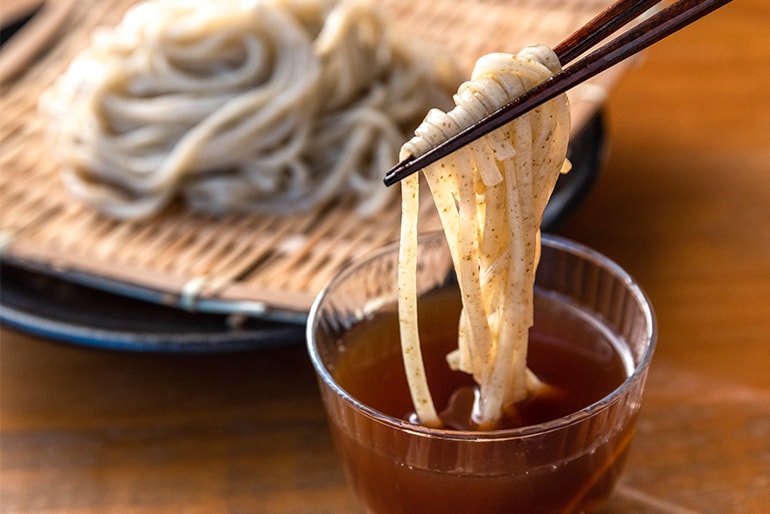 布海苔をつなぎに使っていることから、小麦粉をつなぎにした蕎麦や、十割蕎麦などと比較して、ツルツルとした喉越しが楽しめるのが特徴です。